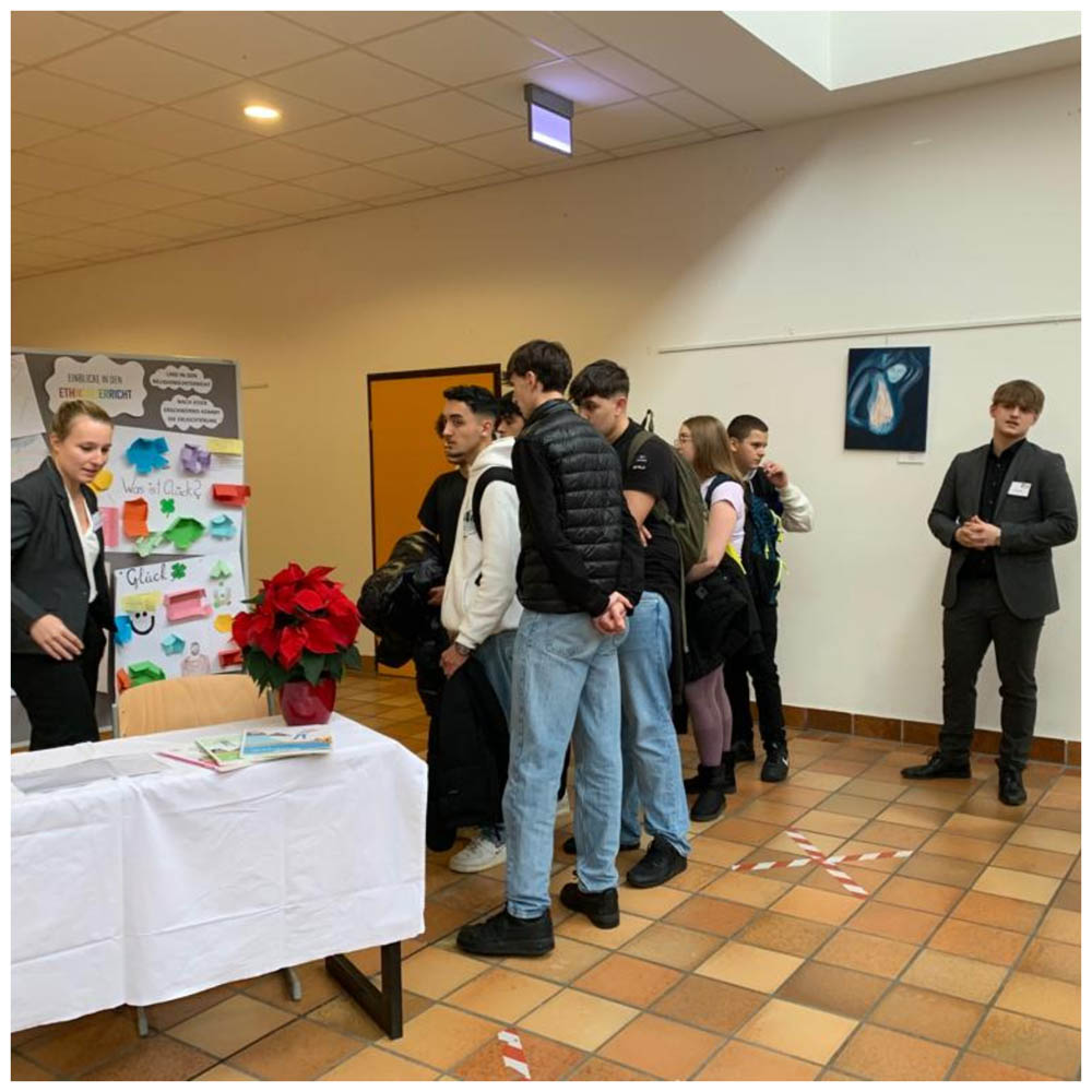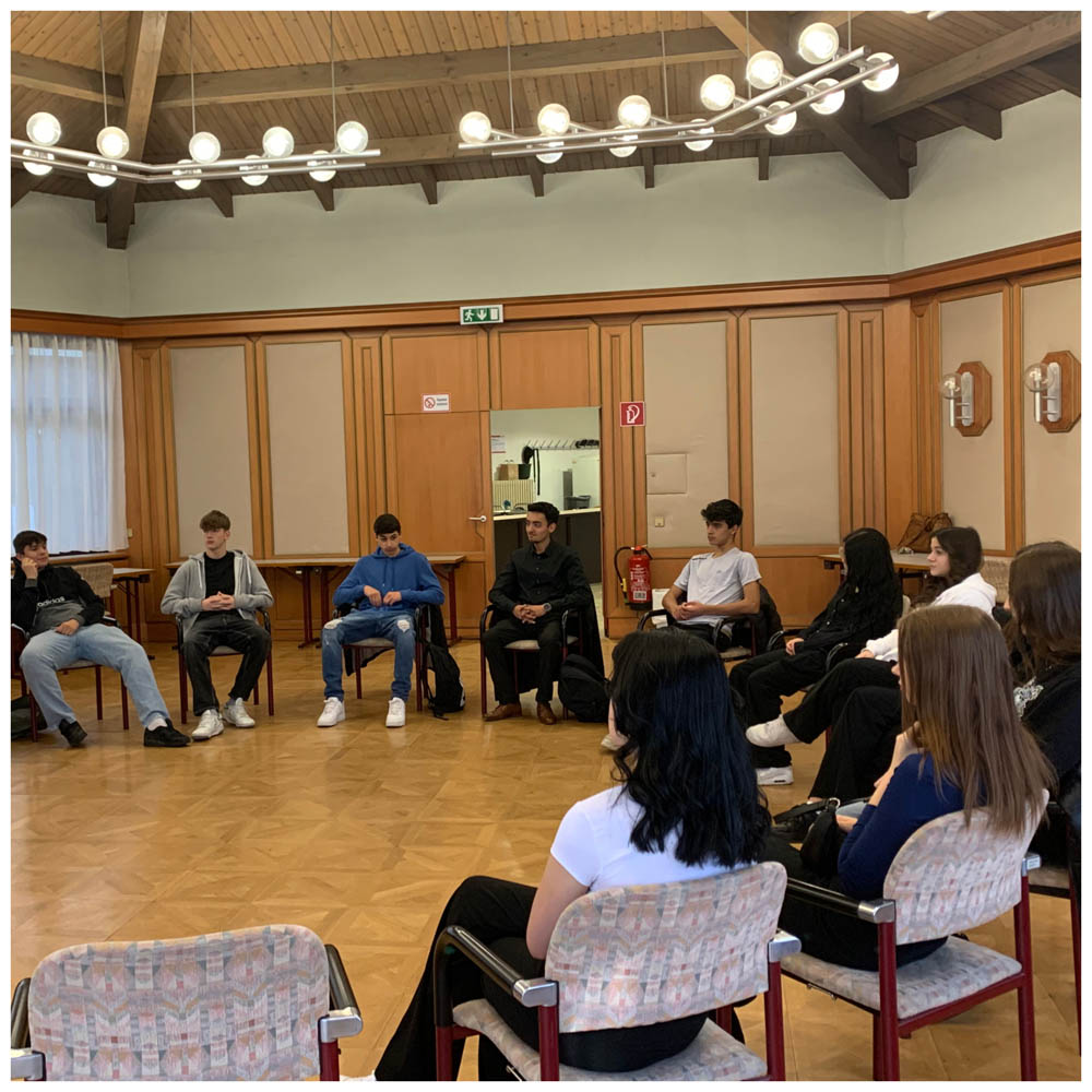 Osam, ein gelernter Physiotherapeut in der Türkei, der sein freiwilliges soziales Jahr im PBZ absolviert, erzählte der Klasse, was zu seinen Aufgaben gehört. Sie erfuhren auch, dass alle Facetten des Lebens wie Freundschaft, Liebe, Streit, Verlust, … im PBZ zum Alltag gehören.