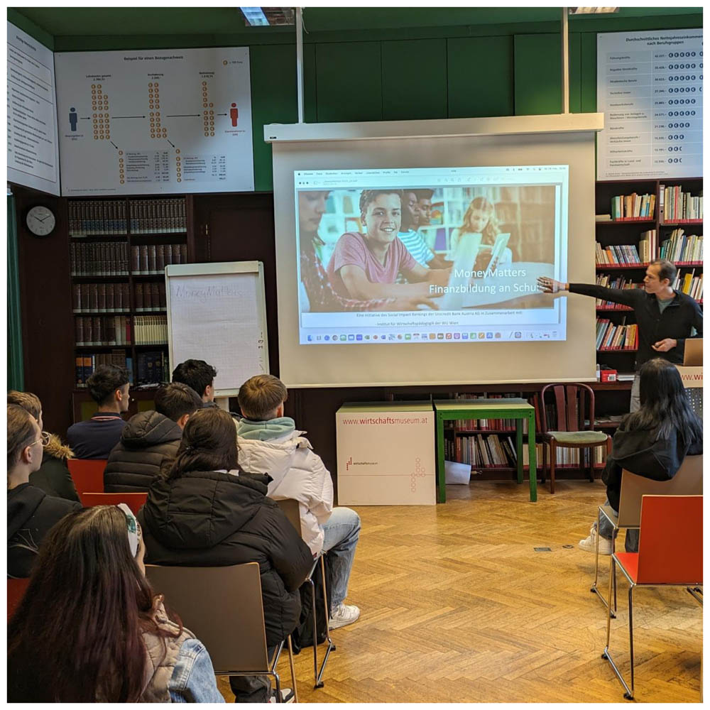 Die Wirtschaftsklassen nahmen am Einführungsworkshop zum Finanzbildungsprogramm MONEY MATTERS im Gesellschafts- und Wirtschaftsmuseum teil. Sie erhielten einen aktiven Einblick in die Welt des Geldes und dessen Bedeutung. Im Anschluss wurde die Registrierung für die Lernplattform vorgenommen, wo die 6 Basis Module bis Mitte Juni durchlaufen werden und bei Erfüllung mit einem Zertifikat honoriert werden.