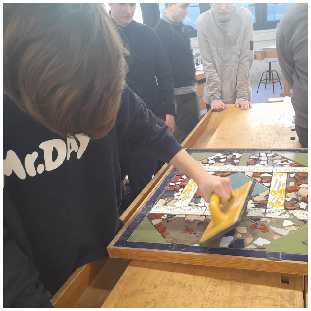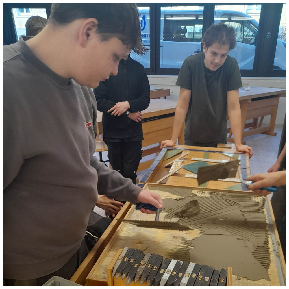 Im Rahmen des Fliesenprojektes der Holz- und Bau- Klasse konnten die Schüler:innen erste Erfahrungen mit dem Werkstoff Fliese sammeln. Unter fachkundiger Anleitung des Fliesenlegers Roman Stürmer erstellten sie in Gruppenarbeit ein Fliesenbild. Die können sich sehen lassen!