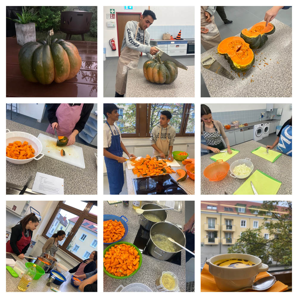 “Wenn dir das Leben einen Kürbis gibt, dann mach Suppe daraus”: ganz nach diesem Motto arbeiteten die Schüler:innen der Klassen BH1 und W1 am gemeinsamen Projekt Kürbissuppe von “The Shop”. Der Riesenkürbis direkt aus Frau Bruckbergers Garten wurde zerlegt, zu einer köstlichen Suppe verarbeitet, verkauft und natürlich auch gemeinsam genossen!