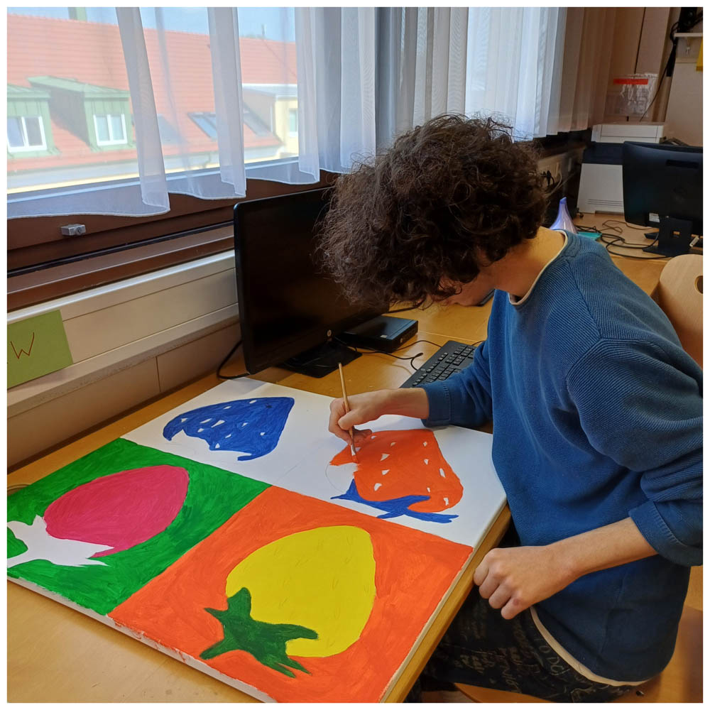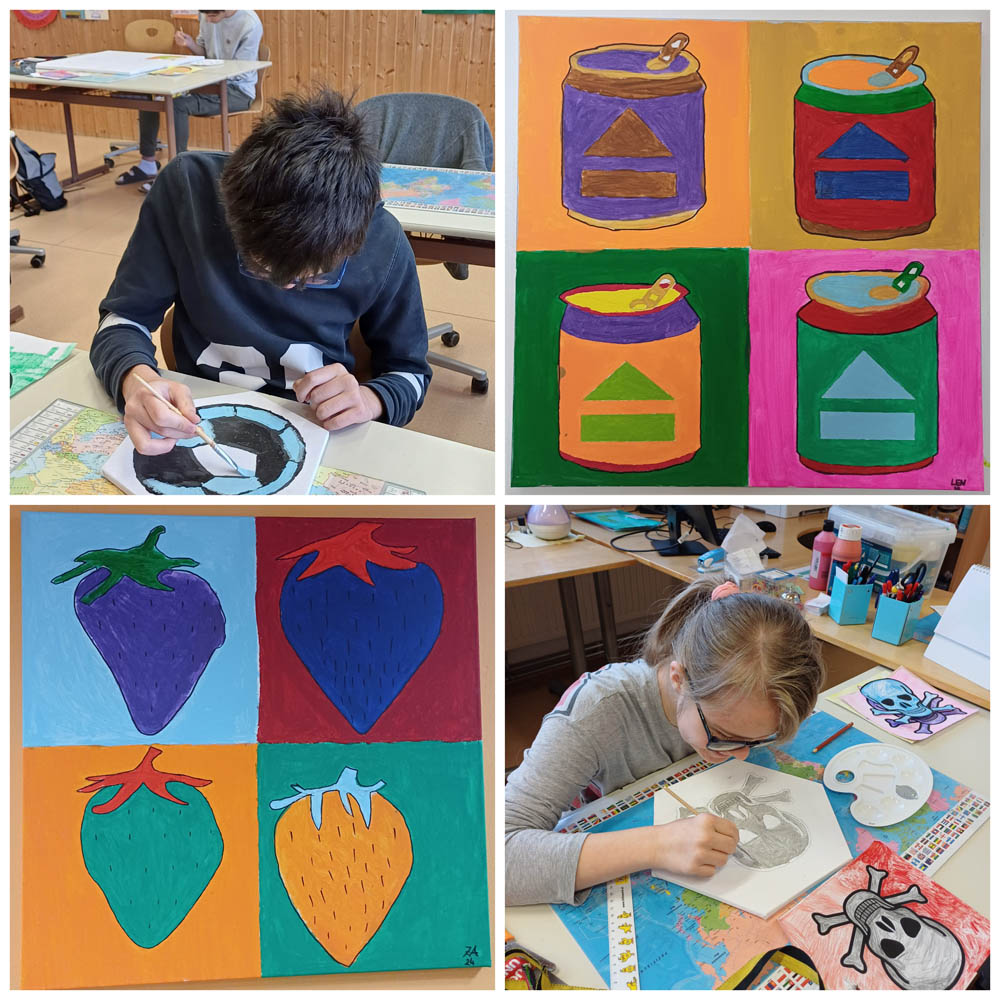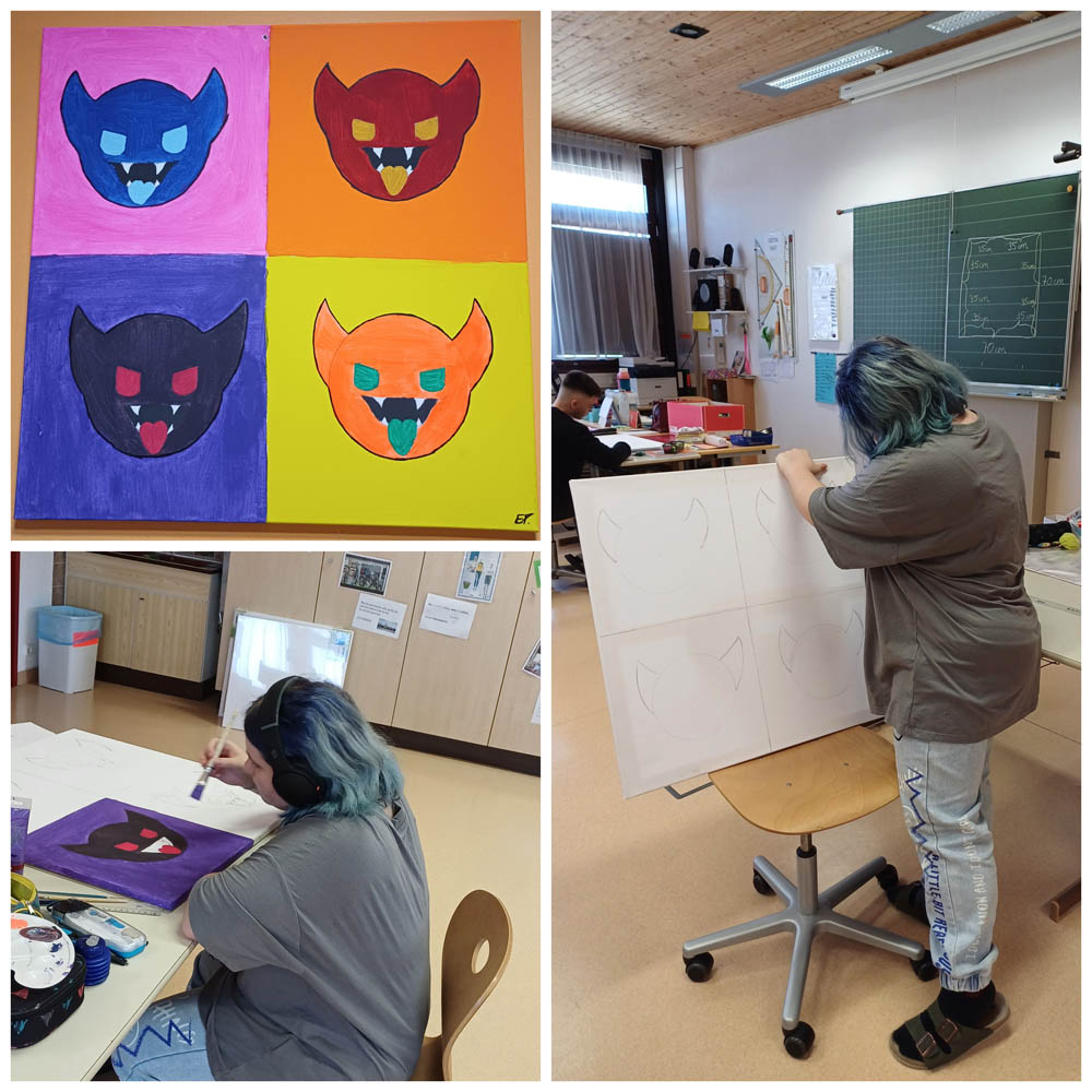 Die Klasse KiB 1 beschäftigte sich gemeinsam mit der Lehrerin Brigitte Förster-Johannides mit dem Künstler Andy Warhol, seinem Werdegng und seiner speziellen Art zu malen. Dies inspirierte die Schüler:innen eigene Motive zu finden und eine Leinwand ähnlich wie Andy Warhol zu gestalten. Hier seht ihr die ersten Ideen, Skizzen und das Entstehen der Leinwände sowie die fertigen signierten Kunstwerke, die nun unser Schulhaus schmücken! Die Schüler:innen arbeiteten motiviert mit und unterstützten sich bei Bedarf gegenseitig mit Ideen.