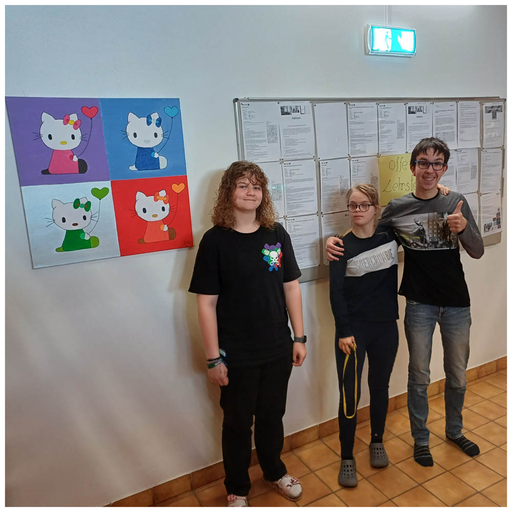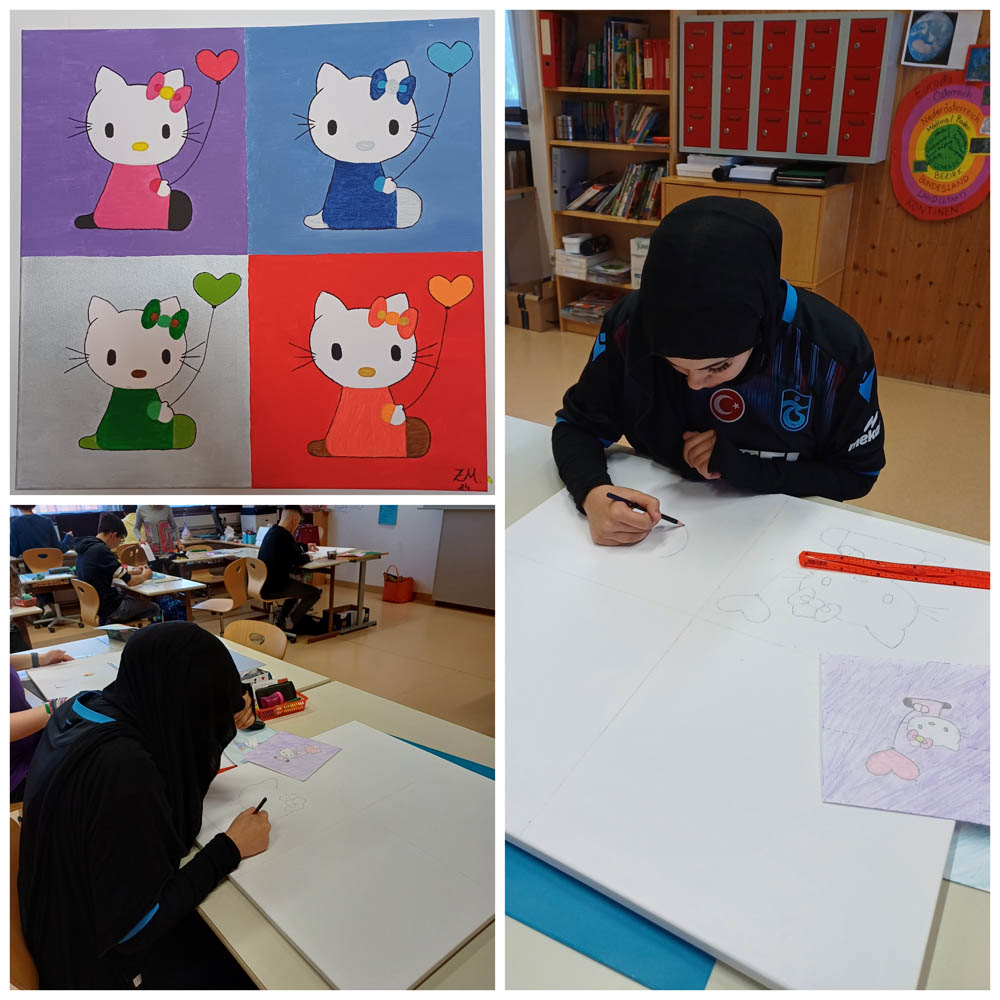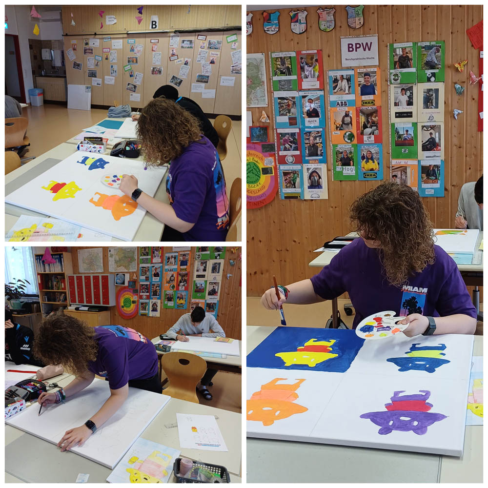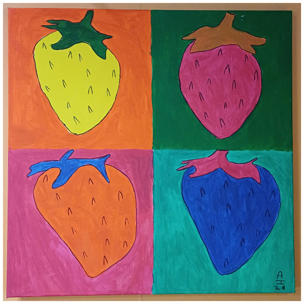 Die Klasse KiB 1 beschäftigte sich gemeinsam mit der Lehrerin Brigitte Förster-Johannides mit dem Künstler Andy Warhol, seinem Werdegng und seiner speziellen Art zu malen. Dies inspirierte die Schüler:innen eigene Motive zu finden und eine Leinwand ähnlich wie Andy Warhol zu gestalten. Hier seht ihr die ersten Ideen, Skizzen und das Entstehen der Leinwände sowie die fertigen signierten Kunstwerke, die nun unser Schulhaus schmücken! Die Schüler:innen arbeiteten motiviert mit und unterstützten sich bei Bedarf gegenseitig mit Ideen.