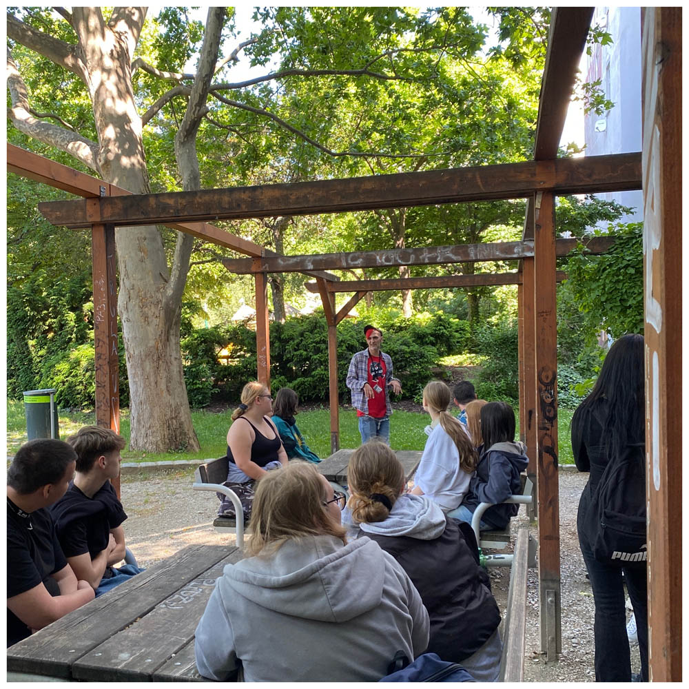 Am 29.05. tauchten die 29Wirtschaftsklassen gemeinsam mit Martin in sein damaliges "Nimmerland" in Wien ein. Auf der 2-stündigen Tour vom Karlsplatz ausgehend bis zum Park beim Haus des Meeres, erzählte der nunmehr 40Jährige den Schüler:innen von seinem schleichenden Weg in die Sucht beginnend im Alter von 11 Jahren und von seinem schweren und langwierigen Ausstieg aus der Sucht und den Konsequenzen, die ihn lebenslang begleiten werden. Die Jugendlichen erhielten persönliche Einblicke in den Alltag eines drogenabhängigen Obdachlosen und wie er den Weg in ein geregeltes Leben, dem Punk weiterhin innerlich wie äußerlich verbunden, zurückgeschafft hat, gemeinsam mit seiner Lebenspartnerin und dank toller Unterstützung ihrer Familie.
