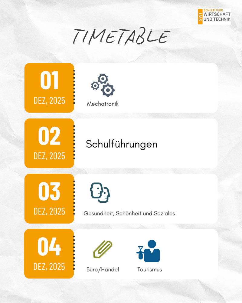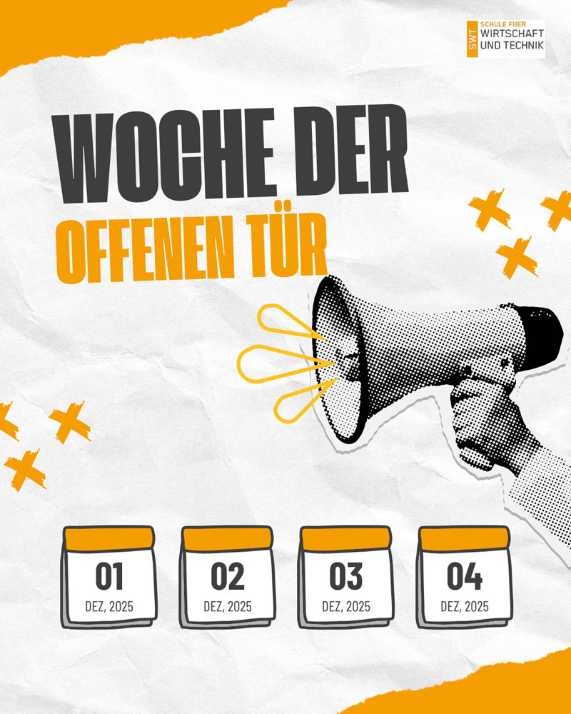 Die Woche der offenen Tür steht vor der Tür: ab dem 1. Dezember habt ihr die Chance, einen exklusiven Blick hinter die Kulissen der SWT Mödling zu werfen! Erlebt den Schulalltag hautnah und entdeckt die verschiedenen Fachbereiche, die wir zu bieten haben:
